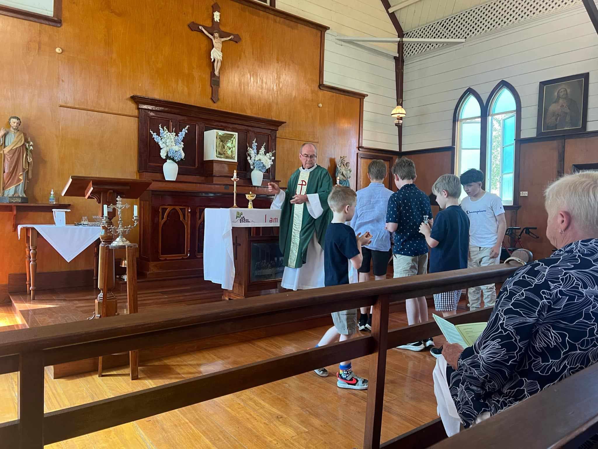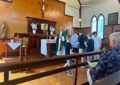 The 10 acre block on which the church stands was designated as a school site and was purchased from the Crown by Fr. Benedict Scortechini for 10 pounds. A small church of sawn timber was built in 1883. This church was called St. Columba’s, and in early 1884 the church began to be used as a school. With the construction of a new St Mary’s in Beaudesert, the Kerry Church/School was sold to Mr T.F. Plunkett, of Kerry, and was converted to a barn on his property. The old church building of St Mary’s, was dismantled, re-erected at Kerry, and renamed St. John’s, with Fr. Enright opening the church on the 28th of June 1908.